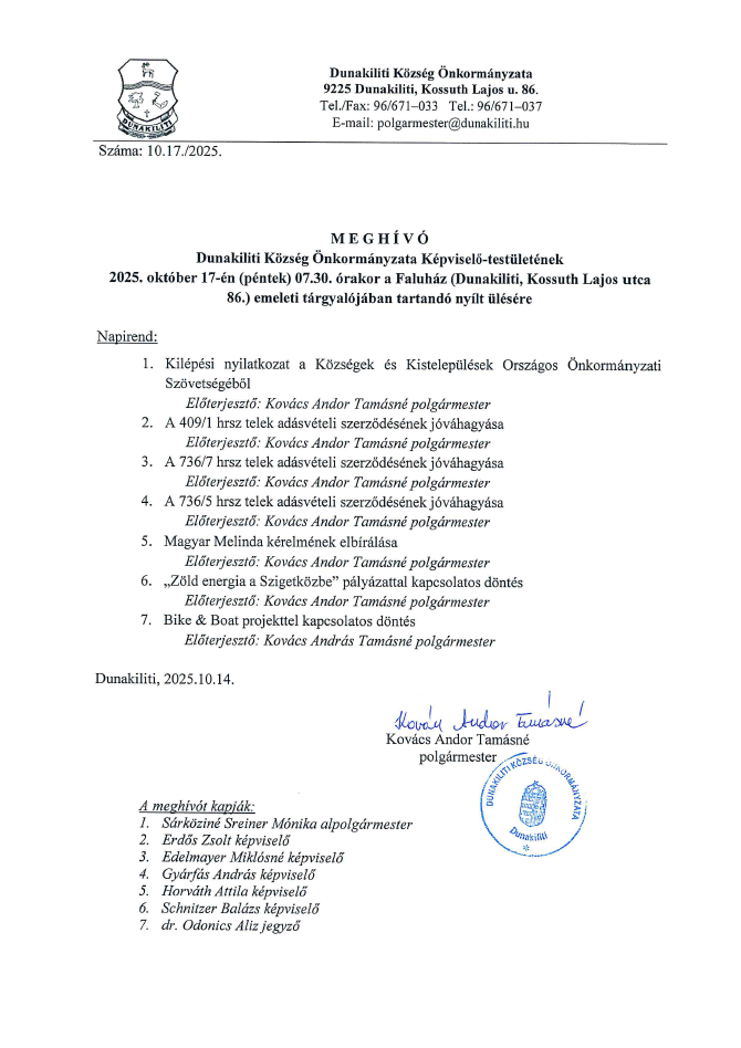 Helye: Közös Önkormányzati Hivatal (Dunakiliti Kossuth Lajos utca 86.)